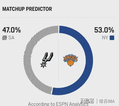 反觀尼克斯,上一場以127-98大勝雄鹿,近期整體發(fā)揮平穩(wěn)。輸球場次里,僅一場不敵步行者,另外三場分別負于活塞(兩場)和騎士;贏球名單中則包括火箭、凱爾特人等強隊。球隊進攻依舊圍繞布倫森展開,今天對陣馬刺,能否贏下這場硬仗,關鍵要看布倫森和唐斯的發(fā)揮。賽前,美媒ESPN預測本場比賽,馬刺勝率47.0%,尼克斯勝率53.0%!